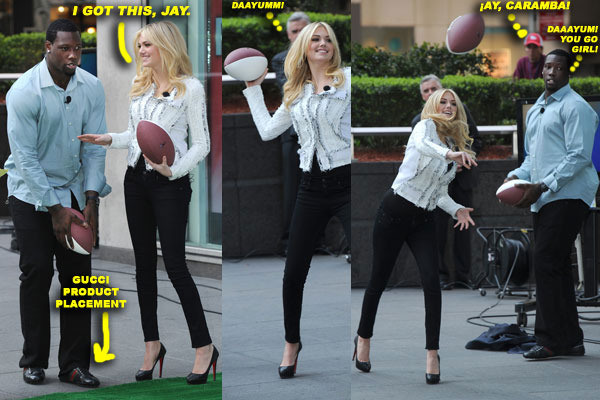 These were snapped earlier this morning as Kate Upton & NY Giants defensive end Jason Pierre-Paul made an appearance on ‘Fox & Friends’ in Midtown, NYC. They plugged the NFL draft, as well as took part in a football challenge which called for each person to show off their throwing skills. I gotta admit, Kate’s pretty damn good. We should also mention that both Jason & Kate are working the nonprofit Fitness Without Borders, which will hold another event later today in NYC.